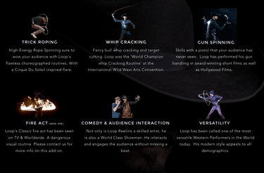 Loop Rawlins is a One Man Wild West Performance that is the stand out act for corporate events. A unique blend of skill, character, & humor making for a memorable performance. Loop Rawlins has been performing professionally for over 20's years and has appeared in Cirque Du Soleil in Las Vegas as a featured specialty act for three years and was a Quarterfinalist on America's Got Talent.