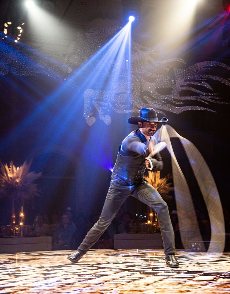 His act of trick roping, whip cracking, and fancy gun spinning has thrilled thousands of audiences.